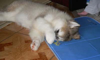 "Me and my coolmat.. I still get a little warm, so Daddy bought me this Great mat that is always cold!!"